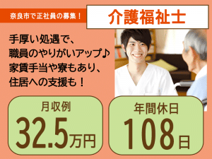 ≪奈良市/介護福祉士/正社員≫★月収例33.5万円◎残業無し◎無料送迎バスあり◎職場見学可◎賞与2.8ヶ月分◎多くの事業を運営する安心の法人★特別養護老人ホームでのお仕事です☆(kyo)