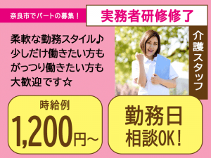 ≪奈良市/実務者研修修了/パート≫★勤務日相談OK☆時給例1,300円~◇車通勤OK◇その他手当あり◇正社員登用あり◇無料送迎バス★特別養護老人ホームでのお仕事です☆(kyo)