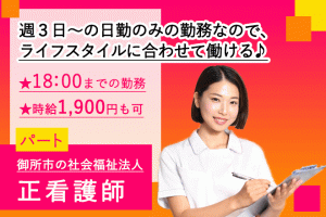 ≪御所市/正看護師/パート≫嬉しい日勤のみ!18:00までで夕食にも間に合う★時給例1900円♪高齢者短期入所の併設施設で看護のお仕事です☆