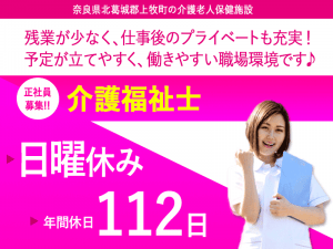 ≪北葛城郡/介護福祉士/正社員≫★賞与4.0ヶ月分◎残業月平均2時間◎日曜休み☆月収例23.1万円~☆夏期・冬期休暇◎年間休日112日◎手当充実★介護老人保健施設におけるデイケアのお仕事です☆(kyo)