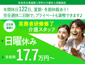 ≪北葛城郡/実務者研修修了/正社員≫★日曜休み◆諸手当充実◆賞与4.0ヶ月分◆年間休日112日◆残業月平均2時間◎マイカー通勤可★介護老人保健施設におけるデイケアのお仕事です☆(kyo)