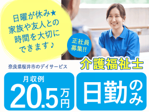 ≪桜井市/介護福祉士/正社員≫★月収例20.5万円◇日勤のみ◇残業ほぼなし◇賞与2.6ヶ月分◇通勤手当月5万円迄◇日曜休み◇特別休暇年7日◇福利厚生充実★デイサービスでのお仕事です☆(kyo)
