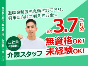 ≪生駒市/無資格・未経験OK!/正社員≫賞与たっぷり3.7ヶ月分◎退職金制度◎住宅・扶養手当もあり♪デイサービスでのお仕事です☆
