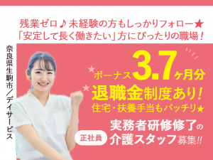 ≪生駒市/実務者研修修了/正社員≫◆\安定の厚待遇!/賞与3.7ヶ月分+手当充実+退職金制度あり♪残業なし&通勤手当上限なしで、働きやすさも抜群!◆デイサービスでのお仕事です☆(kyo)