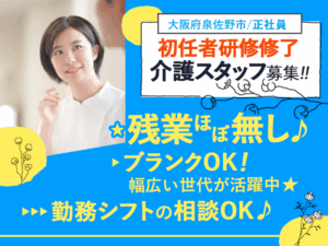 ≪泉佐野市/初任者研修修了/正社員≫◆駅チカ徒歩2分♪幅広い年齢層が活躍中♪残業ほぼ無し♪勤務シフトの相談OK♪お子様がいらっしゃる方も活躍中!住宅型有料老人ホームで介護のお仕事です☆(osa)