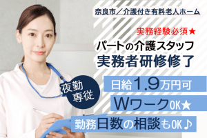 ≪奈良市/実務者研修修了/パート≫夜勤専従!日給1.9万円♪お休みの相談OK◎Wワーク歓迎!介護付き有料老人ホームで介護のお仕事です☆(BO)