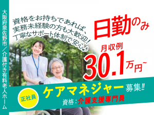 ≪泉佐野市/ケアマネジャー(介護支援専門員)/正社員≫◆月収例30.1万円~☆日勤のみで残業なし☆退職金制度あり☆ケアマネ未経験歓迎☆ケアマネ業務に専念できる環境◆介護付き有料老人ホームでのお仕事です☆(osa)