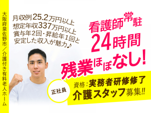 ≪泉佐野市/実務者研修修了/正社員≫◆想定年収337万円~!月収例25.2万円~◎看護師24時間常駐◎残業ほぼなし◎2024年11月にリニューアルオープン◎経験不問◆介護付き有料老人ホームでのお仕事です☆(osa)
