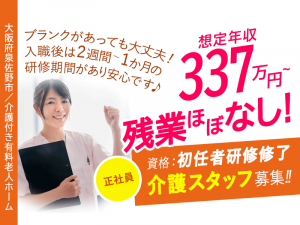 ≪泉佐野市/初任者研修修了/正社員≫◆看護師24時間常駐◎想定年収337万円~!月収例25.2万円~◎残業ほぼなし◎2024年11月!リニューアルオープン◎研修充実◎車通勤OK◆介護付き有料老人ホームでのお仕事です☆(osa)