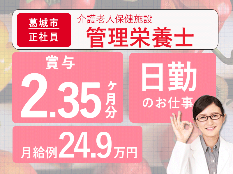 ≪葛城市/管理栄養士/正社員≫月収例25.9万円!嬉しい日勤のみ♪充実の研修制度&保育園完備で働きやすさ抜群♪(kyo)