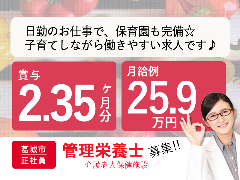≪葛城市/管理栄養士/正社員≫月収例25.9万円!嬉しい日勤のみ♪充実の研修制度&保育園完備で働きやすさ抜群♪(kyo)