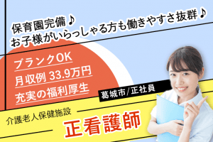 ≪葛城市/正看護師(老健)/正社員≫月収例33.9万円!ブランクOK☆保育園完備でお子様がいらっしゃる方も働きやすさ抜群♪介護老人保健施設でのお仕事です☆(kyo)