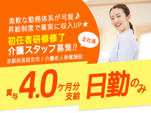 ≪長岡京市/初任者研修修了/正社員≫★地域に根差した安定法人☆賞与年2回☆柔軟な勤務形態☆残業少なめ☆週休2日制★介護老人保健施設(通所)でのお仕事です☆