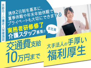 ≪京都市/実務者研修修了/正社員≫★賞与あり☆週休二日制☆託児所完備☆未経験からスタートOK☆各種手当充実★介護老人保健施設(通所)でのお仕事です☆