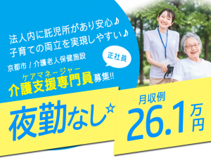 ≪京都市/介護支援専門員(ケアマネージャー)/正社員≫★夜勤なし☆利用可能な託児所あり☆交通費支給☆経験不問で応募可能☆年2回の高水準賞与★介護老人保健施設でのお仕事です☆