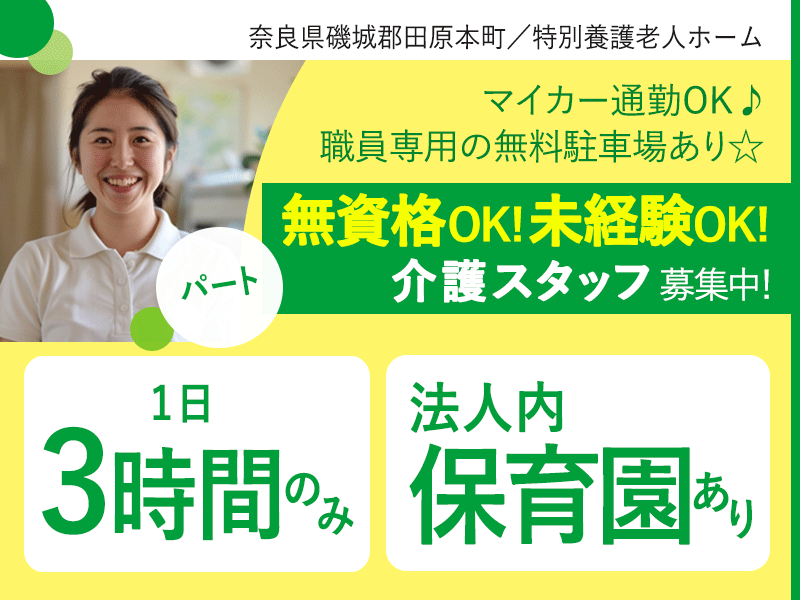 ≪磯城郡/経験不問の介護士/パート≫★給与改定★2025年6月~さらに高待遇に!無資格・未経験歓迎!1日3~6時間で勤務時間が選べる◎昇給あり◎駅から徒歩スグ★特別養護老人ホームでのお仕事です☆(kyo)