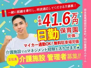 ≪磯城郡/介護施設 管理者/正社員≫月収例41.6万円♪介護施設でのマネジメント経験を活かせます★保育園完備◎特養の幹部候補♪(kyo)