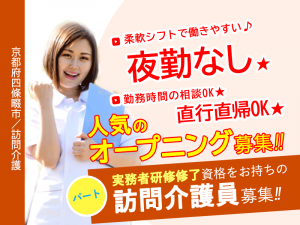 ≪四條畷市/訪問介護員(実務者研修修了) /パート≫◆人気のオープニング募集☆夜勤なし☆直行直帰OK☆勤務時間の相談OK☆最大時給例2000円!処遇改善手当1万円〜支給◆訪問介護のお仕事です☆