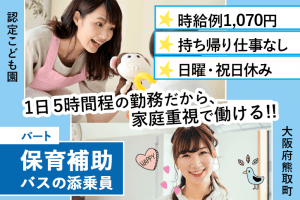≪熊取町/保育補助(バス添乗員)/パート≫1日5h程度の勤務!日・祝お休み★丁寧な指導で安心スタート♪認定こども園でのお仕事です(kyo)