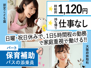 ≪熊取町/保育補助(バス添乗員)/パート≫1日5h程度の勤務!日・祝お休み★丁寧な指導で安心スタート♪認定こども園でのお仕事です(kyo)