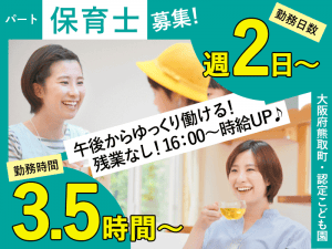 ≪熊取町/保育士/夕方パート≫★14時~や15時~の夕方パート◎勤務日数の相談OK◎家庭との両立OK◎週2日~OK★認定こども園での保育業務(kyo)