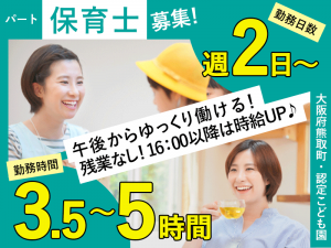 ≪熊取町/保育士/夕方パート≫★14時~や15時~の夕方パート◎勤務日数の相談OK◎家庭との両立OK◎週2日~OK★認定こども園での保育業務(kyo)