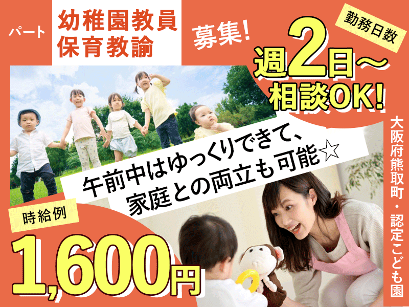 ≪熊取町/幼稚園教諭/夕方パート≫★土曜日や時間により調整手当あり!時給UP◎日曜や祝日はお休み◎午後からの短時間勤務◎週2日~相談OK◎マイカー通勤OK★認定こどもでの保育業務(kyo)
