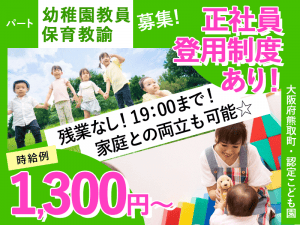 ≪熊取町/保育教諭/夕方パート≫★時給例1,350円~&調整手当あり♪週2日~OK♪14時~や15時からの夕方パート♪マイカーOK♪正社員登用制度あり★認定こども園でのお仕事です☆(kyo)
