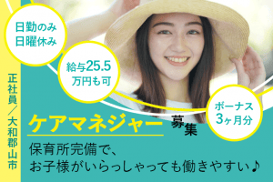 ≪大和郡山市/ケアマネジャー/正社員≫うれしい日勤のみ★日曜休み♪月収例25.5万円♪保育所完備!お子様がいらっしゃっても働きやすい♪老健でケアマネジャーのお仕事です☆(kyo)