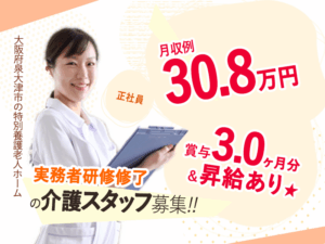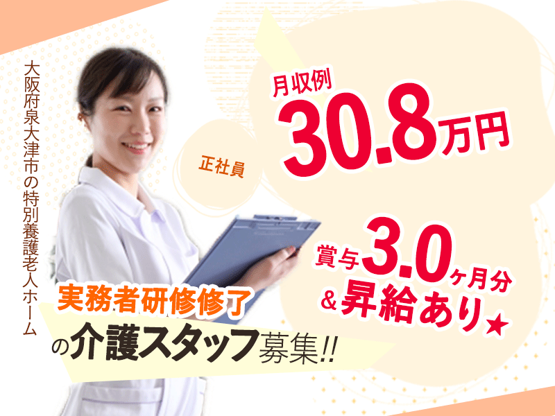 ≪泉大津市/実務者研修修了/正社員≫★月収例30.8万円♪賞与3.0ヶ月分♪毎週2日休み♪経験不問★特養で介護のお仕事です☆(osa)
