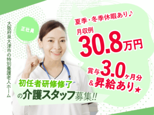 ≪泉大津市/初任者研修修了/正社員≫◆夏と冬の休暇が合計5日◎月収例30.8万円◎賞与3.0ヶ月分&昇給あり◎特養で介護のお仕事です☆(osa)