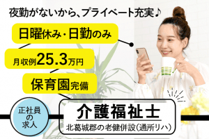 ≪北葛城郡/介護福祉士(デイケア)/正社員≫★\給与UPしました!/2025年6月★日勤のみ!月収例26.6万円♪運転業務なし♪保育園完備で働きやすさ抜群♪(kyo)