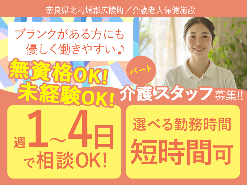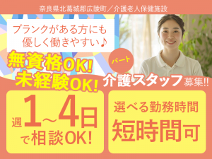 ≪北葛城郡/経験不問の介護士/パート≫★★2025年6月、待遇を全面見直し!★無資格OK☆1日3~6時間で勤務時間が選べる◎髪色自由★介護老人保健施設でのお仕事です☆(kyo)