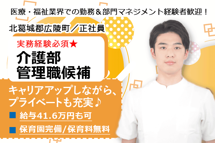 ≪北葛城郡/介護部 管理者/正社員≫月収例41.6万円♪医療・福祉業界での勤務&部門マネジメント経験者歓迎!職員無料の保育園あり◎(kyo)