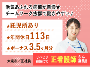 ≪大東市/正看護師/正社員≫賞与3.5ヶ月分★年間休日113日!月収例24.6万円♪託児所完備♪ワークライフバランスもバッチリ◎リハビリ病院で看護のお仕事です☆(osa)