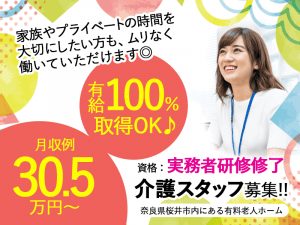 ≪桜井市/実務者研修修了/正社員≫月収例30.5万円~2019年10月オープン★月9休み&残業少でプライベートも充実♪有料老人ホームで介護のお仕事です☆