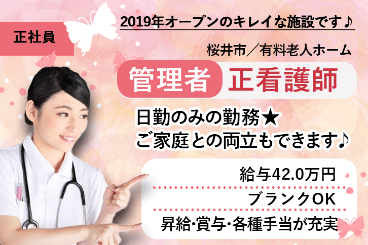 ≪桜井市/正看護師(管理者)/正社員≫2019年10月オープン★日勤のみでご家庭との両立もできます♪有料老人ホームで訪問看護のお仕事です☆