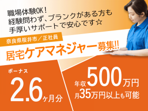 ≪桜井市/居宅の介護支援専門員(ケアマネージャー)/正社員≫★【職場体験OK!】年収500万円・月35万円以上も可能◎賞与2.6ヶ月分◎無料駐車場完備◎業務標準マニュアル完備◎扶養手当あり◎残業少しだけ★居宅介護支援事業所でのお仕事です☆(kyo)