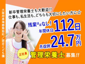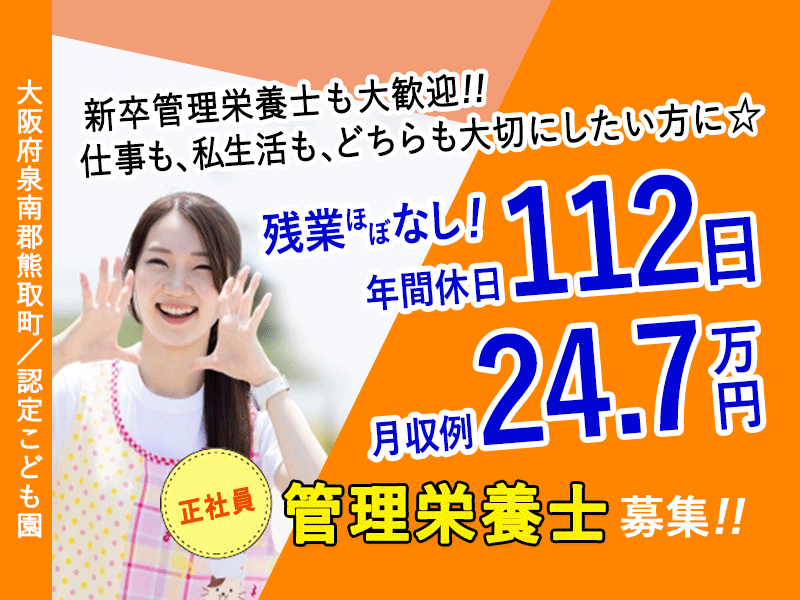 ≪熊取町/管理栄養士/正社員≫仕事も、私生活も、どちらも大切にしたい☆新卒の管理栄養士も大歓迎☆月収例24.7万円♪年間休日112日♪日祝休み♪残業ほぼなし♪20以上の福利厚生★こども園でのお仕事です(kyo)
