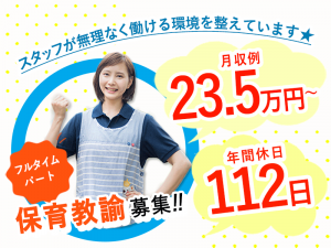 ≪熊取町/保育教諭/フルタイムパート≫★月収例23.5万円~!調整手当あり!さらに時給UP★残業なし★マイカー通勤OK★無料駐車場あり★認定こども園での保育教諭のお仕事です☆(kyo)