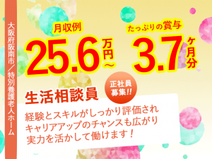 ≪阪南市/生活相談員(介護支援専門員/ケアマネジャー)/正社員≫★有給休暇とりやすい◎たっぷり賞与3.70ヶ月分◎施設での経験者優遇◎宿直手当別途あり◎2018年に新築移転でキレイ◎残業なし★特別養護老人ホームでのお仕事です☆(osa)