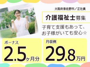 ≪泉佐野市/介護福祉士/正社員≫ボーナス2.5ヶ月分◎保育料全額補助★処遇改善手当一時金あり!月収例29.8万円♪特養でのお仕事です☆(osa)