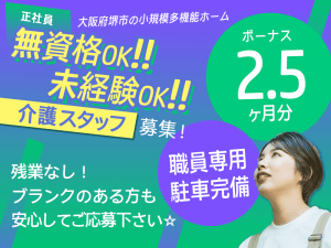 ≪堺市/無資格・未経験OKの介護士/正社員≫賞与2.5ヶ月分♪月収例23.7万円◎退職金は勤続年数不問!小多機で介護のお仕事です☆(osa)