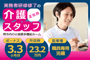 ≪堺市/実務者研修修了/正社員≫無料駐車場完備!月収例23.7万円◎賞与2.5ヶ月分♪小多機で介護のお仕事です☆(osa)