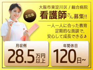 ≪大阪市東淀川区/看護師(病棟)/正社員≫年間休日120日!手当充実♪月収例28.5万円以上!子育てと仕事の両立を応援♪急性期病棟で看護のお仕事です★(osa)