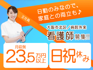 ≪大阪市北区/看護師(外来)/正社員≫日祝休み!月収例23.5万円以上!夜勤なし◎病院で外来のお仕事です★(osa)