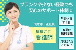 ≪茨木市/看護師(病棟)/正社員≫年間休日111日!手当充実♪月収例27.5万円以上!子育てと仕事の両立を応援♪病棟で看護のお仕事です★(osa)