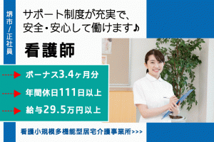 ≪堺市/看護師/正社員≫年間休日111日以上!医療者サポート制度の充実♪月収例25.0万円以上!看護小規模多機能型居宅介護でのお仕事です★(osa)