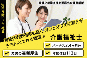 ≪河内長野市/介護福祉士/正社員≫賞与3.4ヶ月分♪子育てと仕事の両立を応援♪看多機で介護のお仕事です☆(osa)
