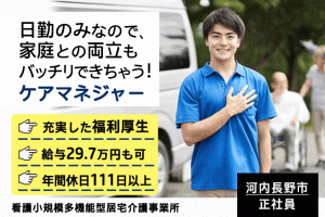 ≪河内長野市/ケアマネジャー/正社員≫月収例29.7万円!日勤のみ◎年間休日111日以上!看護小規模多機能型居宅介護事業所でのお仕事です★(osa)